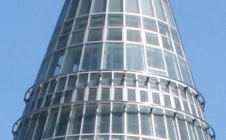 高さ43m開放感満ちあふれる円錐形なエントランスホールは、全面ガラス張りで自然光が優しく差し込む開放的な空間です。高さ28Mに位置する展望台からは久慈市内を一望できるほか牛島をはじめ久慈海岸の美しい眺めを満喫出来るビュースポットとなっています。ガラス造りだけのこの展望台は12億円の巨費が投じられ久慈市のシンボル的な役割を担っております。エントランスに配された琥珀の原石は高さ約40p、幅約40p、重さは約20sにもおよび最大級のもの。琥珀と同様、久慈の特産品を代表する小久慈焼の置物も飾られています。