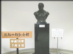記念館ホールにある、五辻勉作の若き頃の三船久蔵先生胸像です。記念写真を撮れるようになっています。 |
