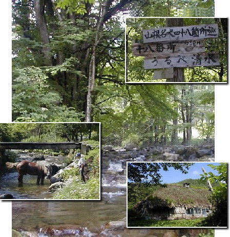 桂の水車広場の奥横の川です。とても景観が良く、川岩のコケ、まわりの木々、調和が取れていて五ッ星でしょう。端神地区には「山根名水48箇所巡」があり、一番所から四八番所まで個々の名前が付けられ、もし時間があれば巡りも楽しいでしょう。端神地区には沢山の良き自然が残されています。川ではお父さんが大きい種馬を水浴びをさせていました。今時この様な光景は他ではみられません。