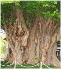 | 本樹は雄株で、日吉神社の社殿の正面にあり、樹勢は旺盛である。市内のイチイの中では胸高幹周と枝張りが最も大きい。 |